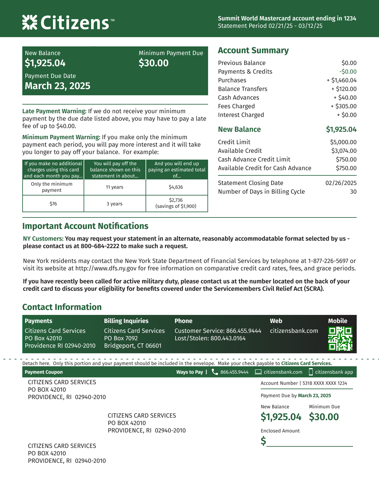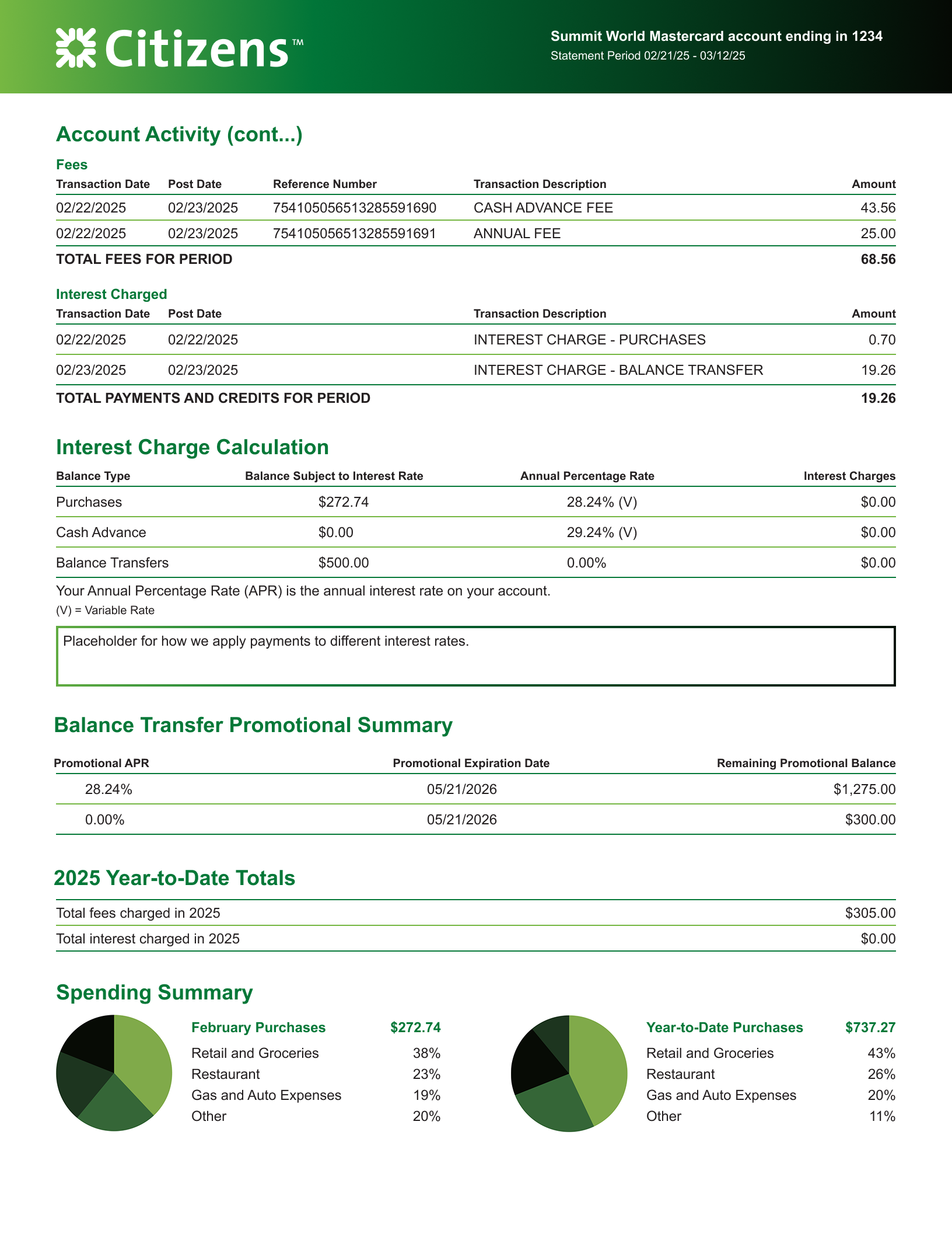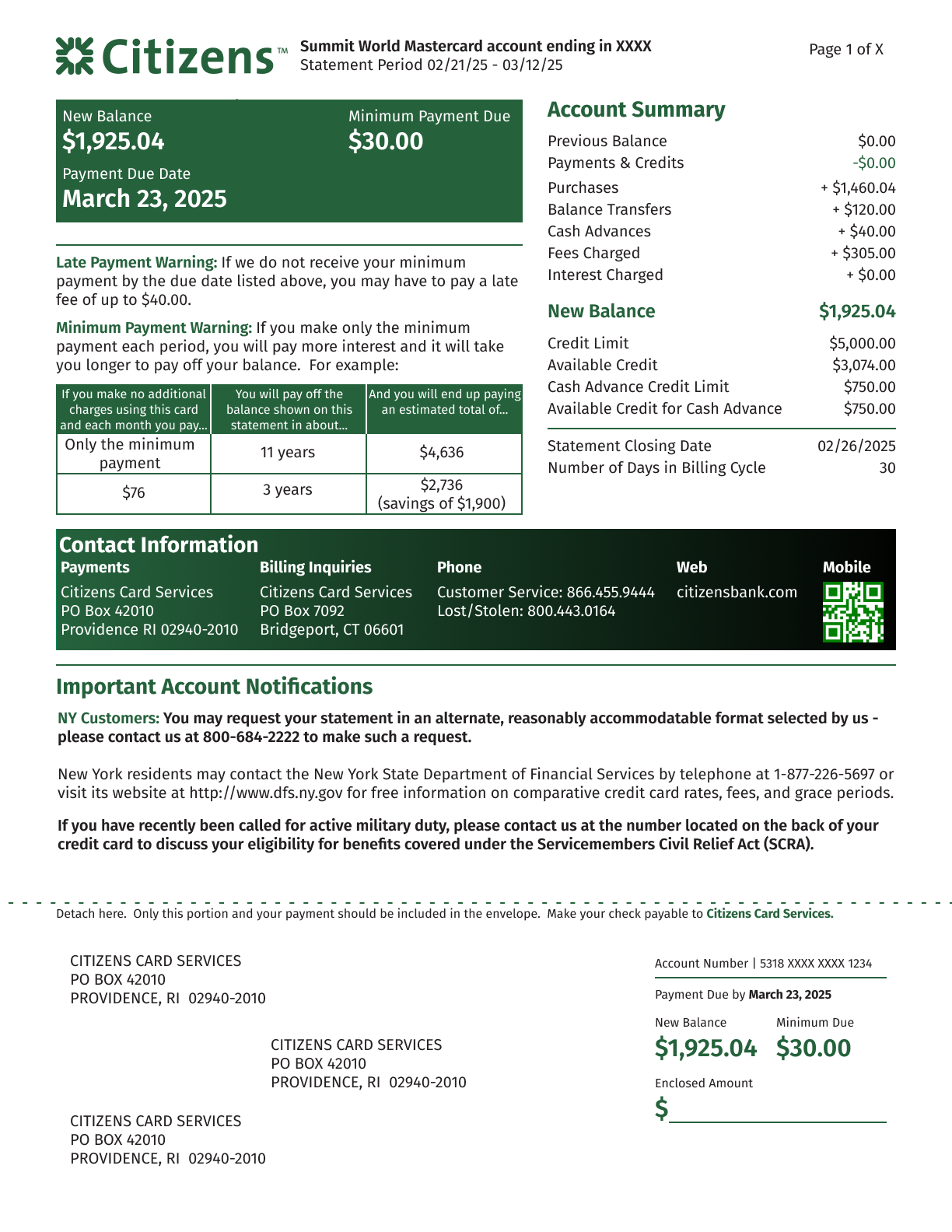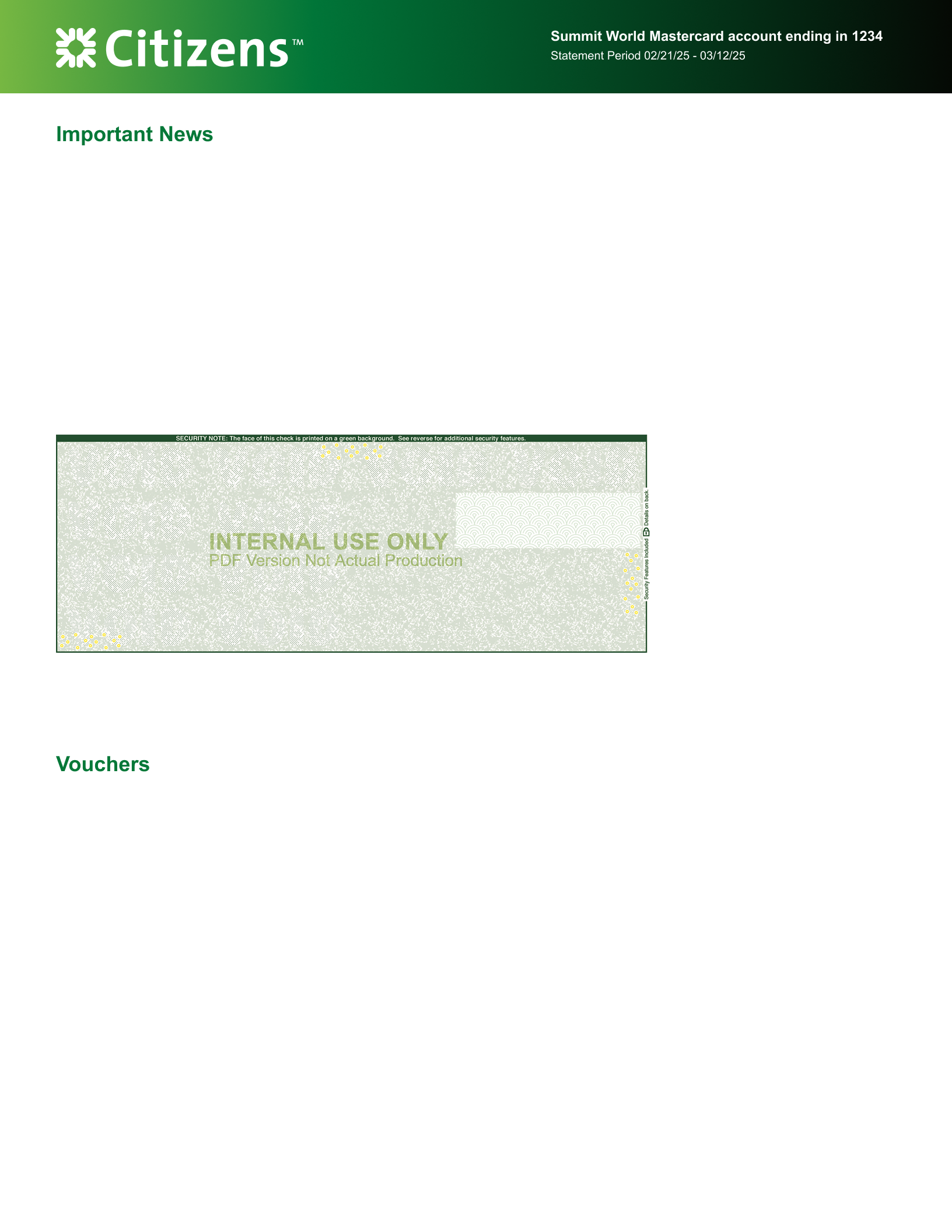 From the explorations we landed on a basic presentation that made sense to our users and the business and worked with my brand team to ensure the colors and styling mapped to our marketing campaign. The original design (and fallback if print had problems) was the flat Citizens Green color, but the gradient was a request that I implemented that caused the page to pop, and allowed us to use one standard for all of our retail bank cards at the same time